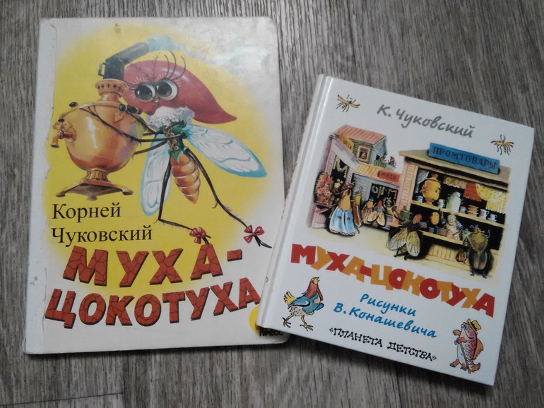 Чуковский у нас есть в больших авторских сборниках с илл.А.Елисеева и В.Сутеева, но это на будущее. Пока небольшие книжки идут лучше. А эти две книжки.... К картонке пока не знаю как относится, изображение самовара дочке нравится, а нашему папе -сами рисунки, в книжке с илл. Конашевича печать не очень.