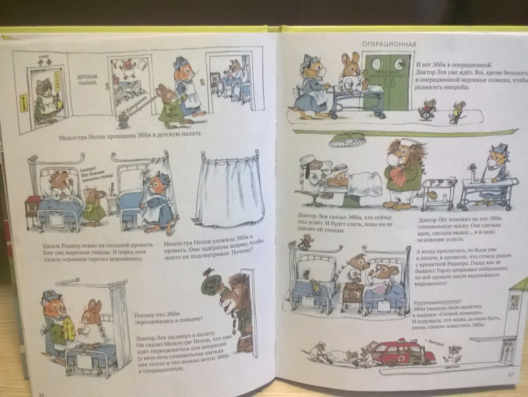 Много "приколов", разных изображений, эта книга развивает воображение. Моя дочь может ее долго рассматривать, находя там кота, или слона, и другие интересные вещи. Я от нее сама балдею, она удивительная. Герои тут теряют ботинки, обижаются, смеются, шутят, фантазируют, в общем живут.