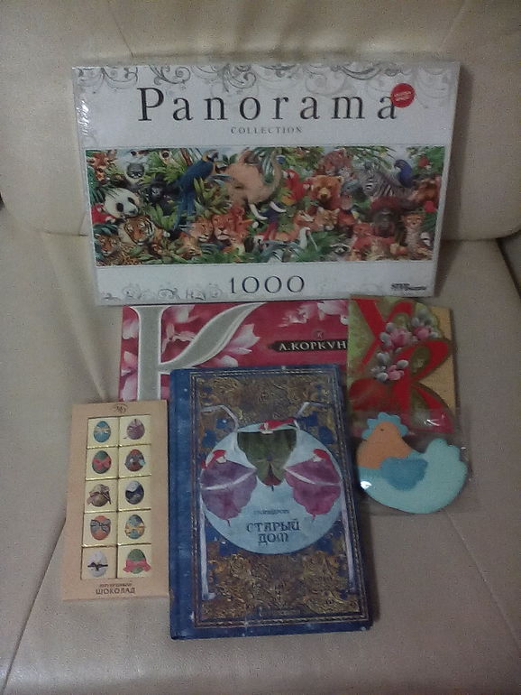 Огромная коробка пазлов - Настена села на больничный и теперь ей есть чем заняться ))), книга - это настоящее сокровище "Старый Дом" сказки Г.Х.Андерсена от Мещерякова, коробка конфет, пряник, набор маленьких шоколадок и открытка с пожеланиями.