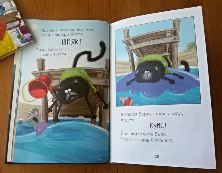 В библиотеке дочка теперь первым делом бежит к стенду, где могут стоять книги про котенка Шмяка. Именно могут стоять, потому что разбирают их моментально. И ни в каждый наш приход они есть в наличии. На этот раз нам повезло и досталась книга про зиму. А долгожданный курьер не так давно принес нам книгу про лето.