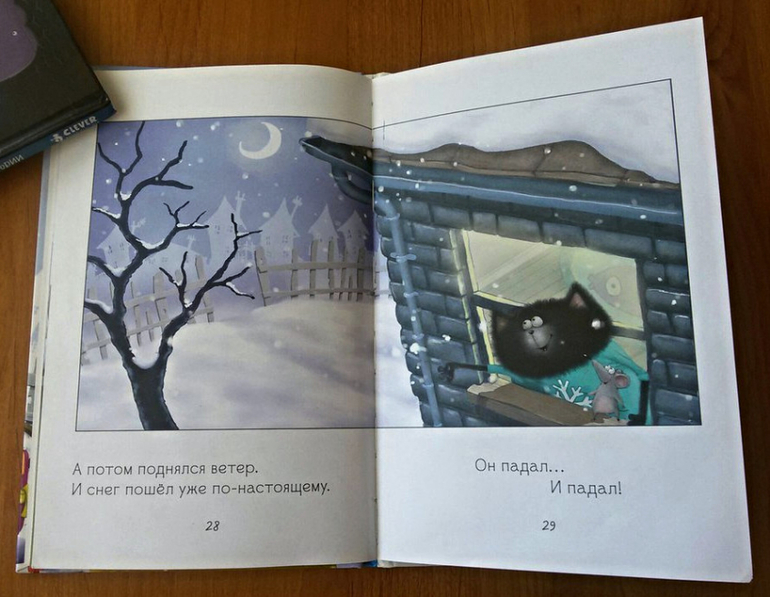Пока сын следил в окно за манипуляциями снегоуборочной техники, мы с дочкой читали Шмяка. В отличии от нас, котенок грустил и ждал снега, чтобы слепить самого лучшего в мире снежного кота. Так и не дождавшись, он решил сделать собственный снег. Следуя своей логике, он смешал холодный лед, пушистые перья и поставил это все под вентилятор, имитирующей ветер.