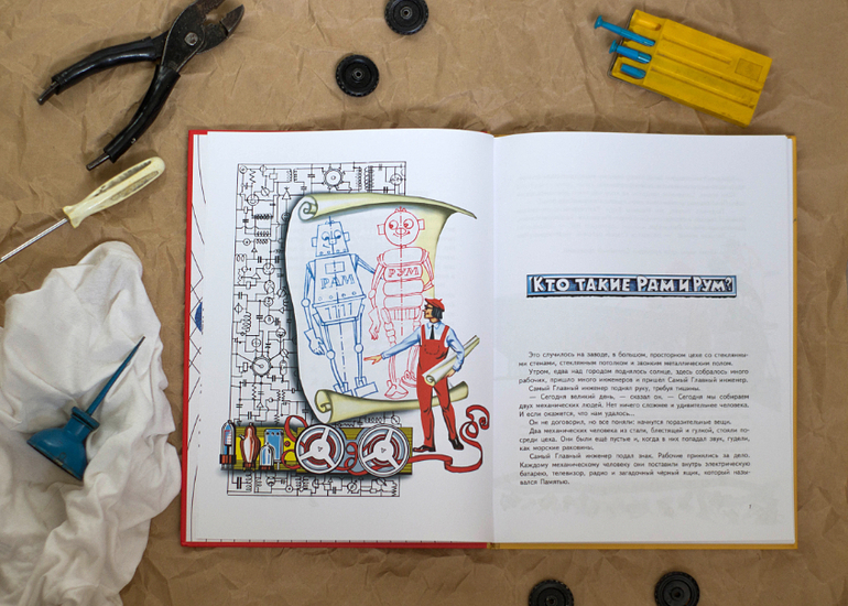 Хотя везде пишут, что книга сугубо мальчишеская, мы с дочкой прочитали взахлеб. На мой взгляд в области литературы гендерные различия весьма условны. И детям часто интересно просто все новое. А уж роботы для нас были явно новым)) История эта о том, как инженеры на заводе создали двух механических человек из стали и дали им имена Рам и Рум.