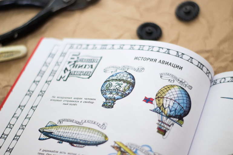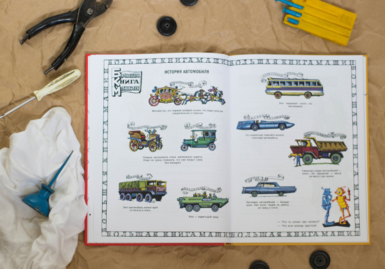 Кстати, в книге есть четыре разворота из Большой книги машин - история корабля, история автомобиля(развитие транспорта от кареты до легкового авто), история авиации, история космических кораблей.