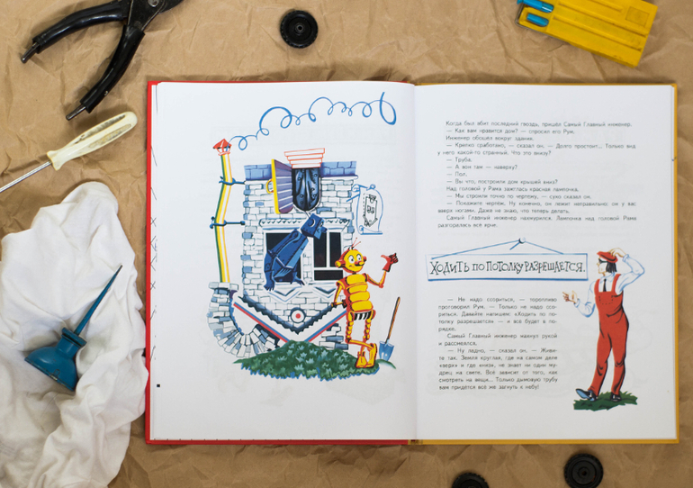 На деле они оказались весьма забавными, и в каждой из глав с ними происходили веселые приключения. То они строили дом по чертежу, и случайно построили вверх ногами. Уже сейчас с высоты прочитанных книг по психологии и детском развитии, я замечаю, как мудро было автору разрешить роботам жить в этом доме, ведь он же получился крепким.