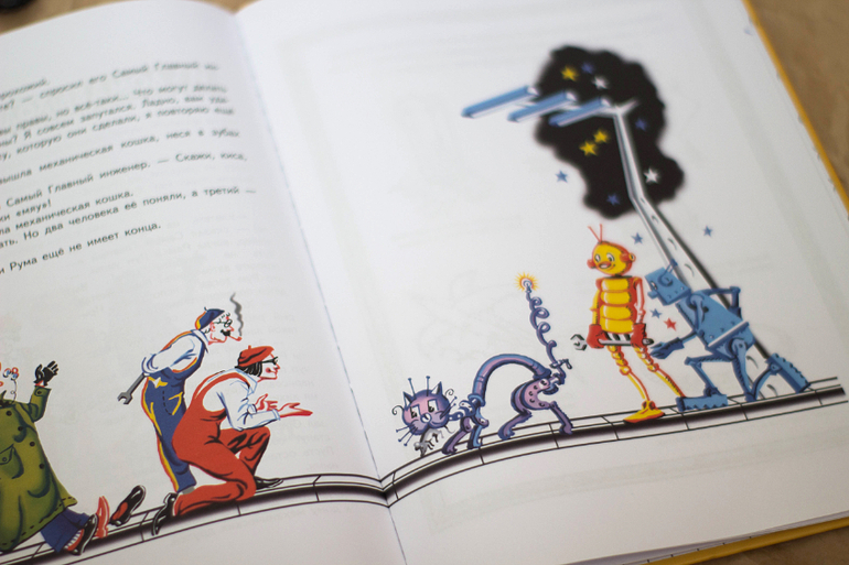 Еще роботы чинили автомобиль, играли в шахматы, летали на воздушном шаре и самолете. Все технические моменты описаны очень просто и кратко, без научных подробностей, думаю, даже трехлеткам по силам.