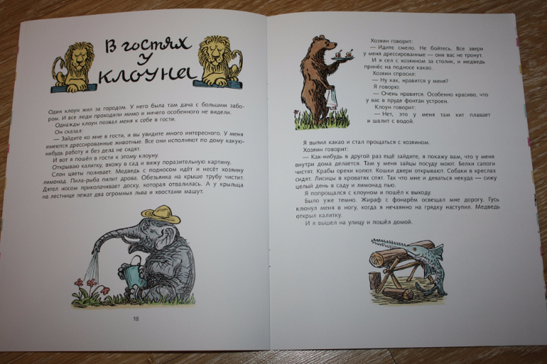 И последний восьмой рассказ про клоуна, который выдрессировал животных так, что они ему во всём помогают: пилят дрова, поливают цветы, открывают дверь, так что ему теперь и делать нечего - только сидеть в саду и пить лимонад, принесённый медведем.