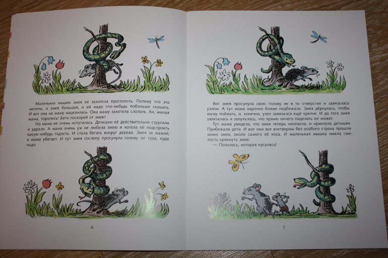 Второй рассказ имеет хорошее название "Попалась, которая кусалась". Мы часто употребляем в речи это выражение, интересно, откуда оно? Не отсюда ли? Про то, как мышка, защищая своих детей от змеи, бегала вокруг дерева, тем самым змея обвила дерево и завязалась узлом.