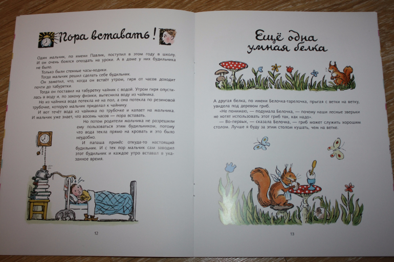 Пятый рассказ "Пора вставать". Мальчик придумал интересный механизм, который его будил по утрам вместо будильника. Правда маме не понравилась мокрая кровать )) И папе пришлось купить настоящий будильник.