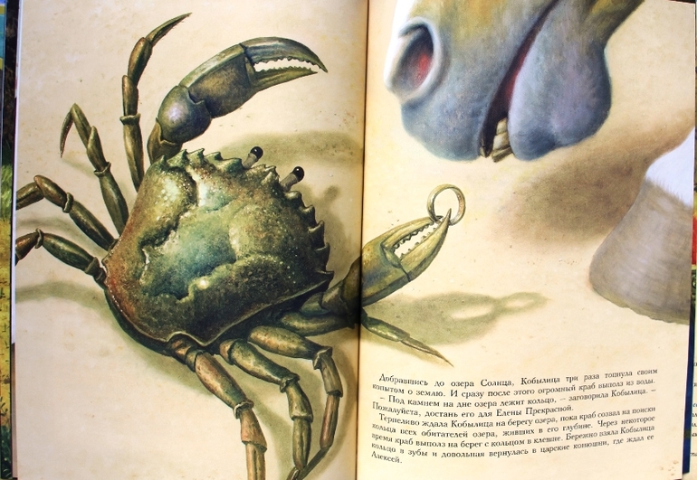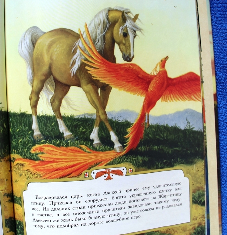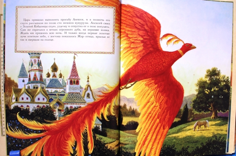 Руф Сандерсон ведет свой рассказ очень гуманно. У нее герой не скачет на маленьком коньке, а везет его крепкая кобылица, нет и жуткого примера братской «любви», нет зависти придворных, герой не хватает Царь-девицу, а приглашает во дворец. И самое главное! Меня всегда коробило читать ребенку, как царь сварился в кипятке, здесь же он не сварился, а тоже преобразился и очень неожиданно. Заканчивается сказка настоящим всеобщим счастьем.