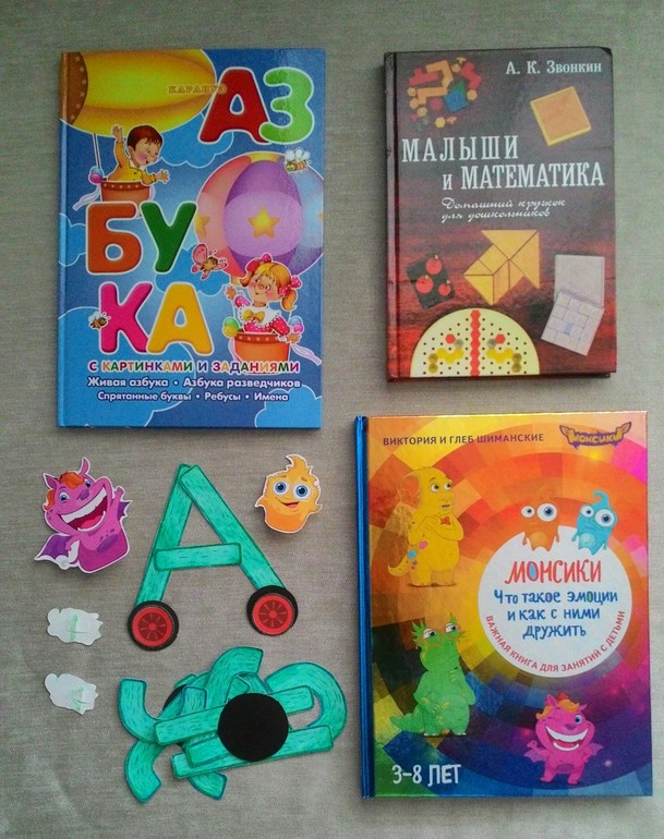* "Азбука с картинками и заданиями". Текста нет, только большие картинки на соотв.буквы. Задания проствые, но нестандартные, интересные. Одно из них - найти вагончик с деталями от буквы. Я сделала детали и сын собирает буквы вживую. Правда, потом приделывает колеса :))