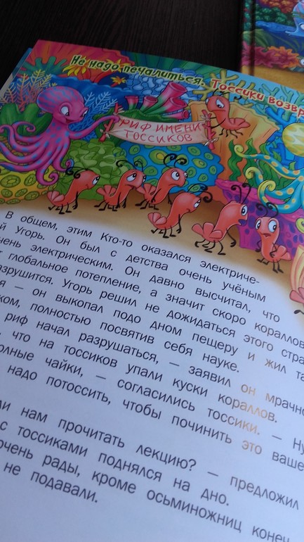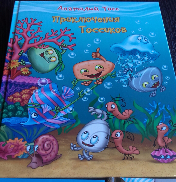 2. Тоссики- ну что сказать, перечитали два раза, сказал на море будет их искать)))) книги ни о чем,как по мне, но сыну понравились приключения камешков))) иллюстрации очень яркие и насыщенные.