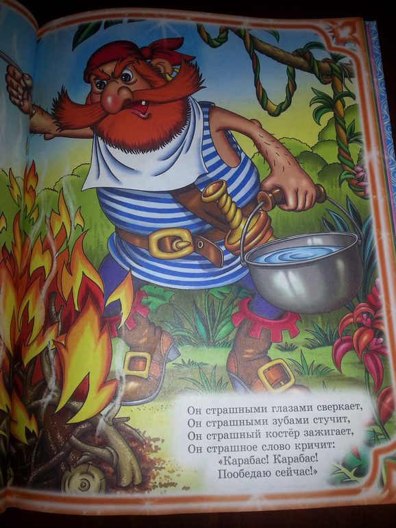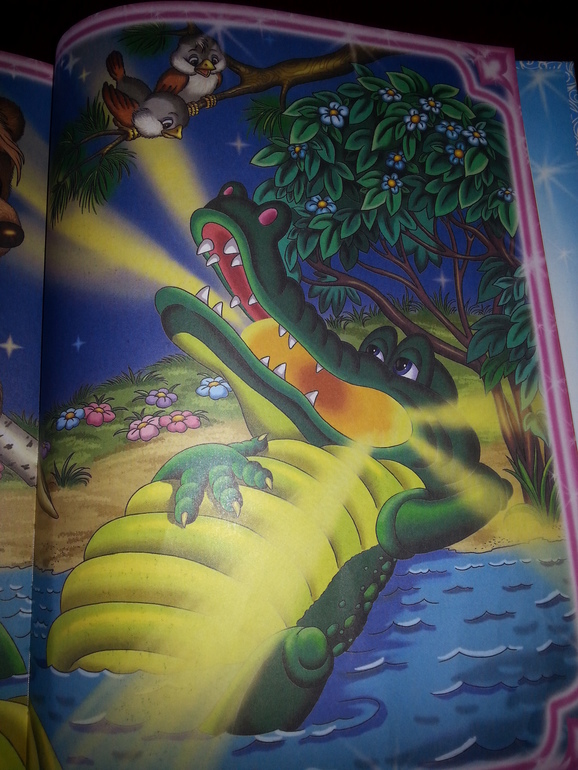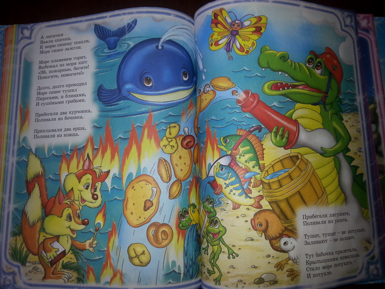 Картинки, конечно, очень мультяшные. Но, что мне нравится, очень подробные и по тексту. Вот разворот из Путаницы, где «Крокодил долго море синее тушил….».