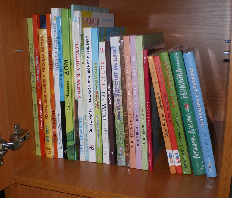 Книжный шкаф в детской, мои в моем шкафу. Иногда показываю, но практически нет. Его это мало интересует.