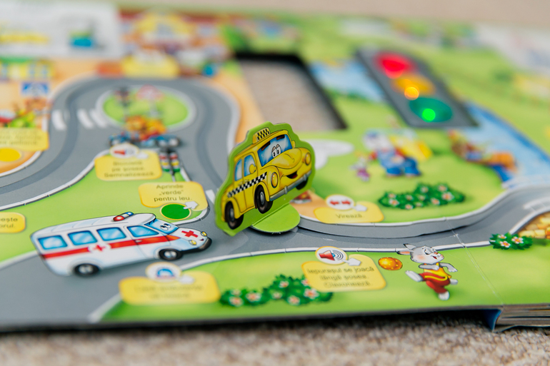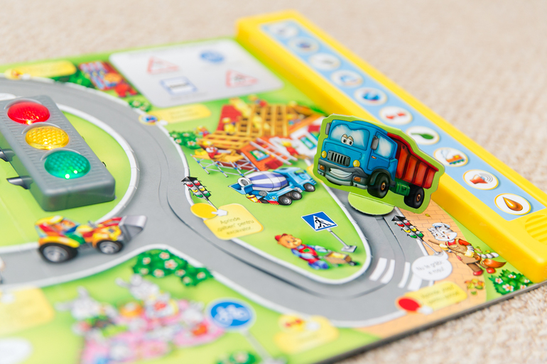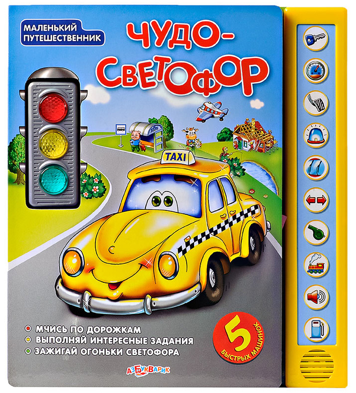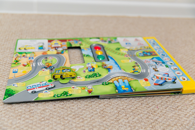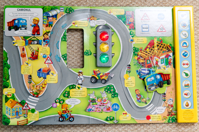 Про наши нежные отношения с "Говорящими книжками" от Азбукварика писала здесь. Когда увидела на выставке книгу из этой же серии со светофором, любой цвет которого включается нажатием на него, заинтересовалась, но подумала, надо ли оно нам... А когда увидела начинку книги, взяла, не раздумывая. 5 разворотов, 5 тематик, по каждому развороту ездит соответствующая машина (такси, пожарная, полицейская, скорая и грузовик), причем на ее пути встречаются препятствия, написаны задания "Уступи дорогу поезду и нажми на звук поезда", "Пропусти пешехода на зебре" и "Не торопись, мигает желтый сигнал светофора" и т.п. Шик, шик, шик! Илья на прогулке забыл про самокат, про озеро, увидел книгу в пакете, и давай просить поиграть. И цена... всего 460 рублей, были 25% скидки!
