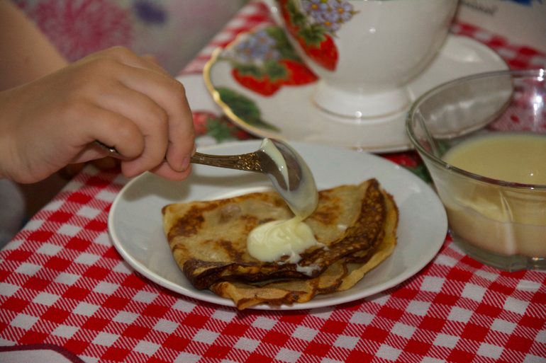 Рося: "Это Кристина меня надоумила весь блин сгущенкой облить, вот я и облил, теперь как я его брать буду, он весь мокрый"!