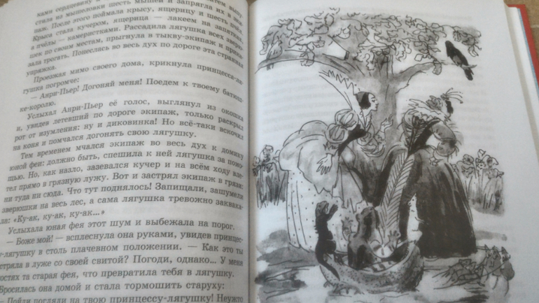 Очень долго выбирала французские сказки. Не знаю, почему решила остановиться на этой. Иллюстраций здесь очень мало: в начале каждой сказки по одной маленькой зарисовочке, и либо больше ничего, либо одна. В одной, по-моему, сказке, 2 иллюстрации. Все они черно-белые и, как мне показалось, местами немного смазаны. Листочки тонковаты, просвечивают. Прочитала первую сказку, изложение понравилось. Оставлю всё-таки эту книгу, почитаем ближе к школе, когда количество рисунков уже не так важно.