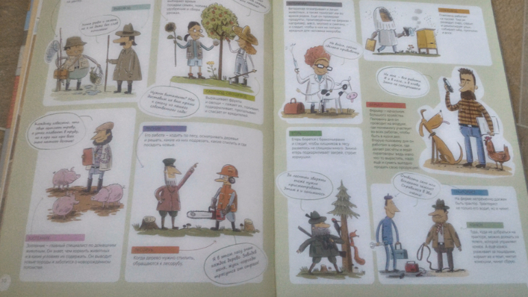 "Профессии" от МП очень долго хотела, цена останавливала. А тут уж гулять так гулять. Отличная книжка: сначала разворот с картинкой (такой стоп-кадр) и подписями, кто где, а потом разворот с пояснениями. Есть про театр, ферму, киностудию, службу спасения, торговый центр и много всего другого.
