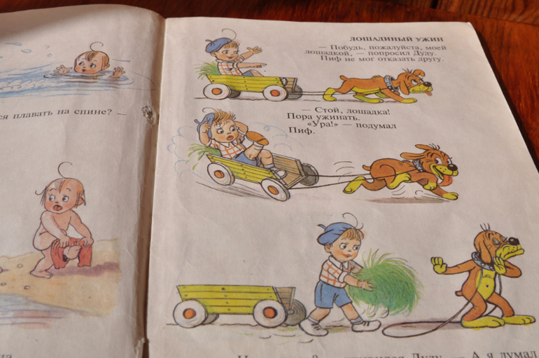 Познакомились с проказником Пифом. И тоже сразу его полюбили, как и малыша Дуду. Андрюша просил читать только те истории, где есть Дуду) Книжка старенькая, в конце явно отсутствуют страницы, но читали с удовольствием.