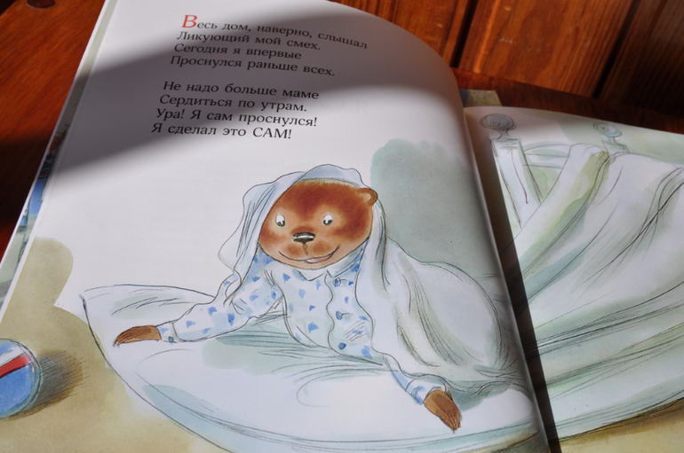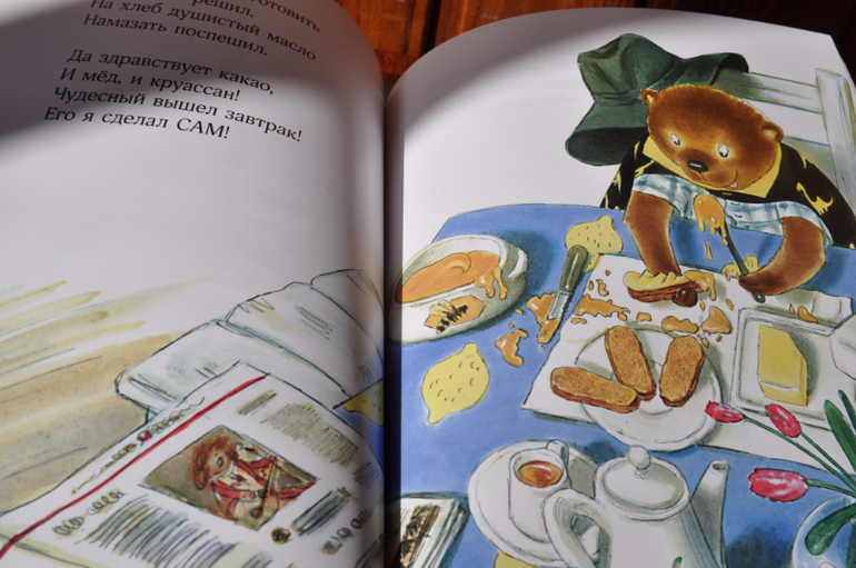 Самый любимый разворот. Андрюша любит перечислять все, чем завтракает медвежонок. А потом просит на завтрак мед и какао))