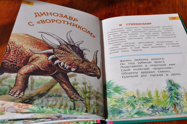 А это такая мини энциклопедия о динозаврах. Конечно, иллюстрации местами размытые, разномастные, но моему любителю динозавров понравилось. К каждому виду есть соответствующий стих. Читали и соотносили с картинками наши фигурки. Нашлись практически все экземпляры) И да, книжечка маленькая, вроде удобная, но некоторые развороты до конца не открываются.