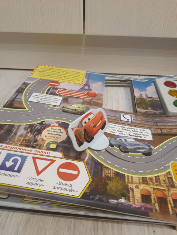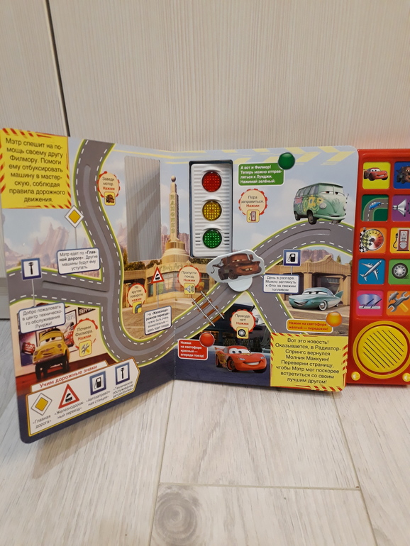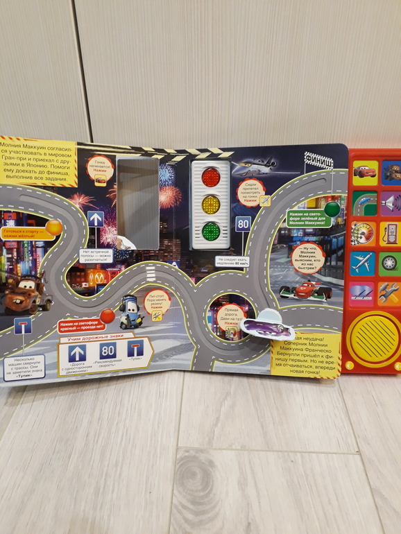 Из плюсов: странички плотные, регулировка громкости есть, машинки двигаются легко, ребенку книга нравится. Из минусов: батареек в светофоре хватило на 10 минут( батарейки в остальных кнопках работают), текст достаточно мелкий ( моему 4-х летке самому читать очень тяжело). Ну и не знаю плюс это или минус:сюжет для увлеченных Маквином.