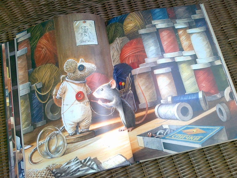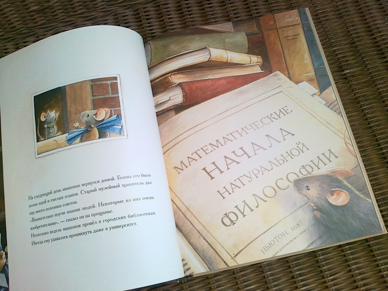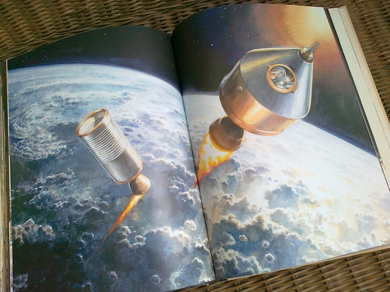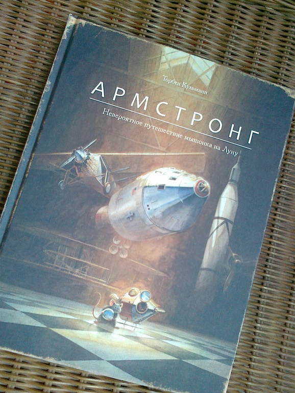 ...Книга Торбена Кульманна "Армстронг. Невероятное путешествие мышонка на Луну" появилась у Сони незадолго до этого разговора. Я, заказывая книгу, предполагала, что Соне она понравится: мыши.., космос.., мыши в космосе... Но такого ошеломляющего эффекта я не могла предвидеть. Изученная от корки до корки, до мельчайших деталей, эта книга никак не ставилась на полку, а всё время находилась в сониных руках. Эффектные иллюстрации, сопровождаемые увлекательным и необычным сюжетом (при минимуме текста, правда), даже мне казались правдоподобными...