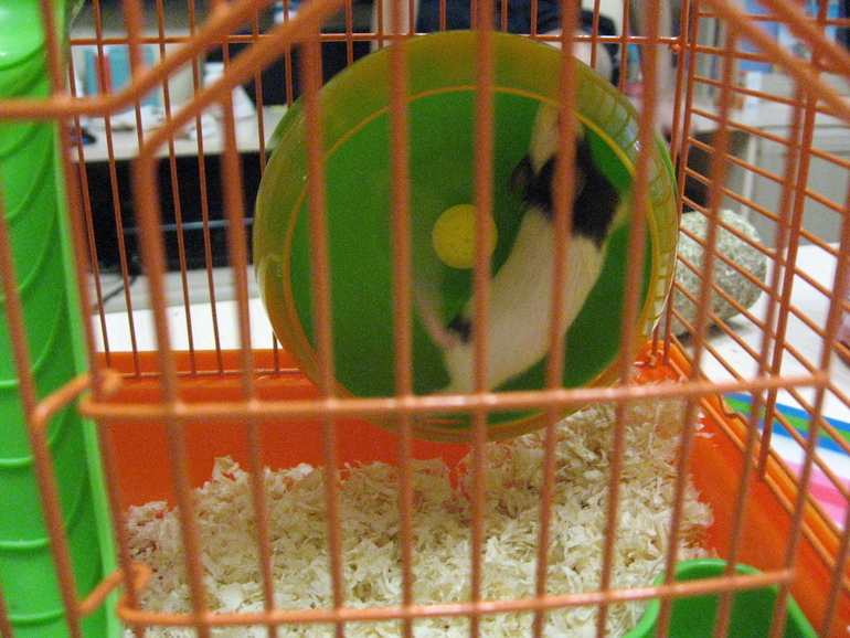 Для того, чтобы выяснить, умеет ли мышка вращать колёсика телескопа, нашли настоящий (!) телескоп, и та в него с любопытством заглядывала. Колёсико, правда она не крутила, но зато потом показала, как здорово она справляется с колесом-центрифугой!