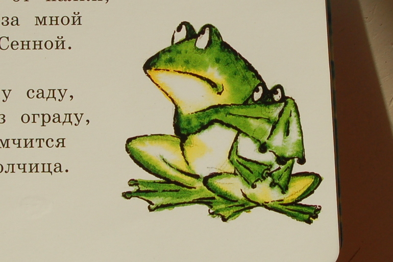 «Мойдодыр» Чуковского с илл.Курчевского от Лабиринта был нами уже читан множество раз, но присутствует в дневнике февраля по причине резкого возобновления интереса и выучивания наизусть. И юмор картинок стал понятен. Вот, например, лягушка прячет своего лягушонка от грязнули с видом «Боже, какой кошмар, не смотри, сыночка».