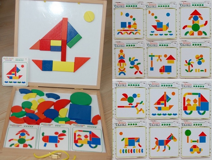 Здесь нам очень пригодился вот такой конструктор - деревянные фигуры на магнитной ленте в коробке с магнитными сторонами. К конструктору прилагается 30 карточек с разным уровнем сложности. Отличная штука!