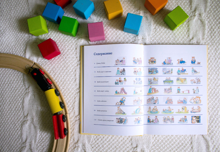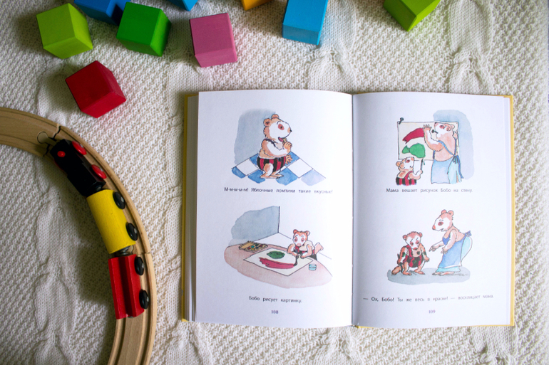 Можете даже не читать дальше мой обзор, купите и сами поймете. Все продумано до мелочей, от имени главного героя БОБО, которое Тася в свои 1,2г уже легко произносит, до оглавления, которым может пользоваться малыш, сам выбирая главы по картинкам.