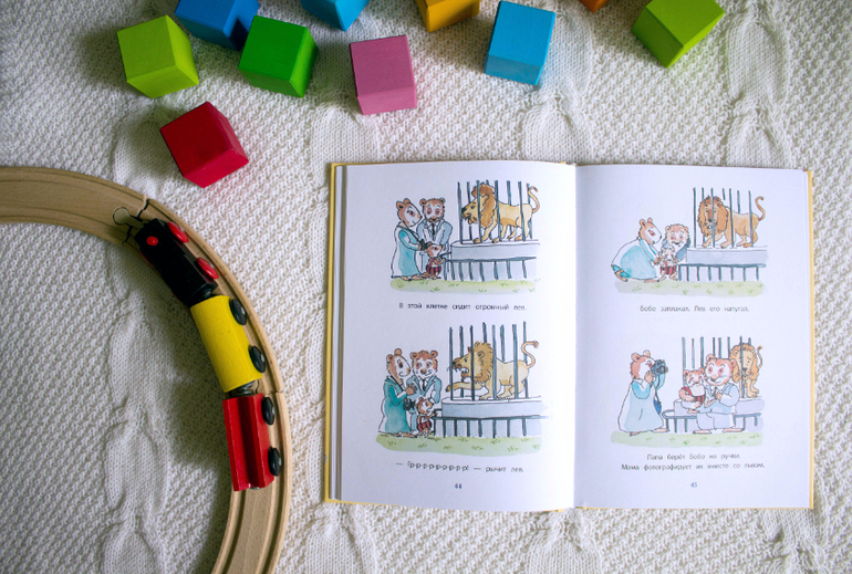 В книге 7 глав, посвященных разным жизненным ситуациям малыша - Дома у Бобо, Бобо идет в магазин, Бобо в зоопарке, Бобо идет гулять, Бобо заболел, Бобо купается, У Бобо день рождения. И самое важное для меня, что это не идеализированная картинка вылизанной семьи, где ребенок ест, все что положили и рисует цветок из 6 ровных кружков, а очень честная книга. Бобо пугается льва в зоопарке, и никто не кричит: "Не бойся, не плачь, он не страшный!" А папа просто берет Бобо на руки.
