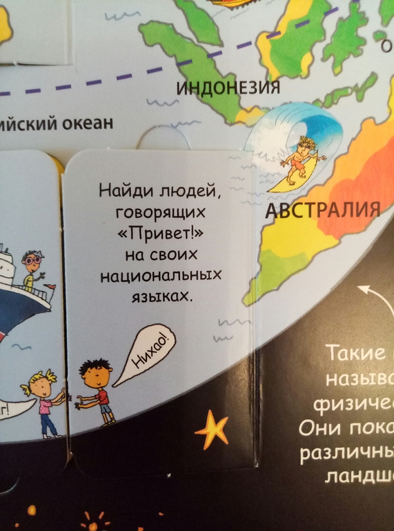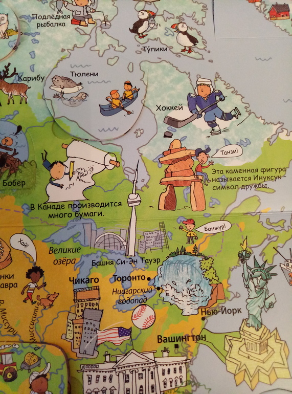 Может, ребенка именно это увлечет и он захочет учить иностранные языки) я сначала удивилась на этом развороте, встретив бонжур) а потом сообразила, там же Канада, а в Канаде французский тоже считается национальным языком.