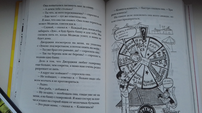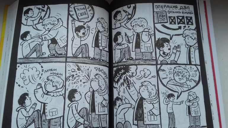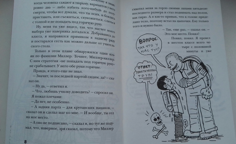 За счет этих иллюстраций, крупного шрифта, больших полей и межстрочных интервалов книга читается очень быстро. Видимо, это должно способствовать привлечению к книге нечитающих подростков.