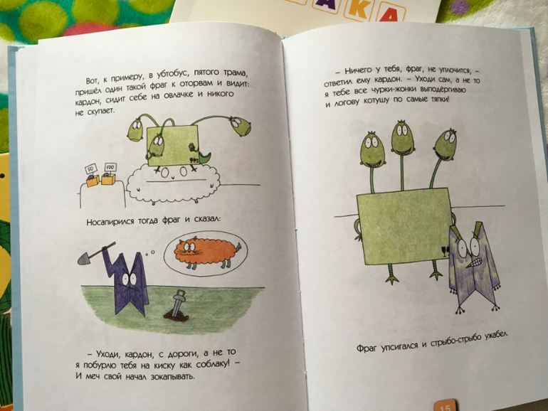 Три тоненькие совсем короткие, там буквально по паре строк на страницу, а основное место занимают рисунки. Книжечки подойдут уже на возраст около четырёх. Но хотя Олесе уже почти шесть, она тоже хохочет и с удовольствием отгадывает языковые загадки вроде такой:
