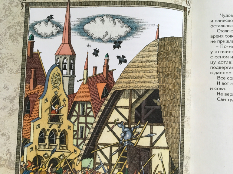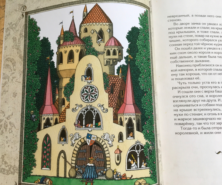 Это совершенно уникальная книга в нашей домашней библиотеке! А потому, что ндинственная, купленная исключительно благодаря мужу )) Он долго ходил вокруг да около неё в Ашане, периодически тыча меня носом обращая на неё мое внимание. Очень ему понравились иллюстрации, такие готичненькие, очень подходящие к сказкам Братьев Гримм (а в этом сборнике только их сказки). Немецкое средневековье во всей своей красе предстаёт перед читателем на этих рисунках. Витражи, шпили, католические соборы, замки...