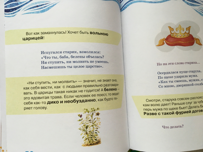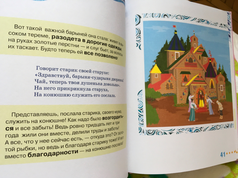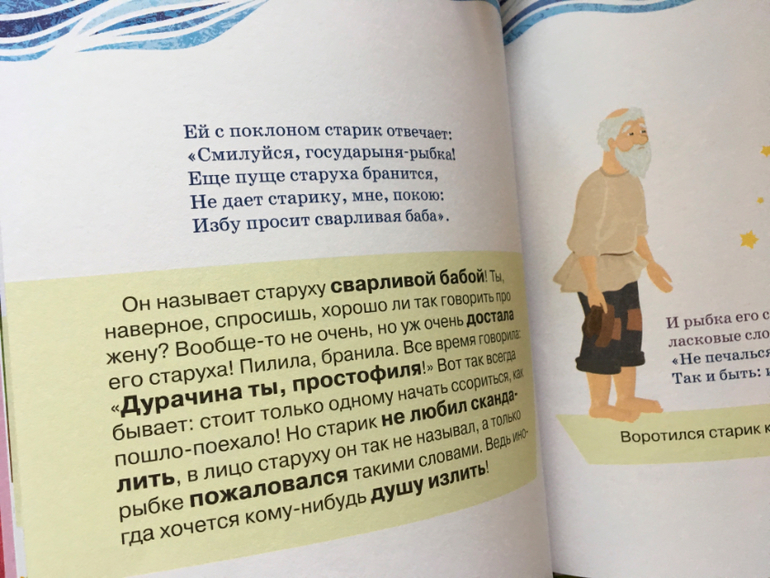 В книге на примере "Сказки о рыбаке и рыбке" подробно расписано, в каком месте и что именно нужно пояснять ребёнку, на что обратить его внимание, на чем сделать акцент. Какими словами охарактеризовать персонажей и их поведение. На некоторых страницах встречаются и задания для ребёнка. В конце приведён весь текст целиком.