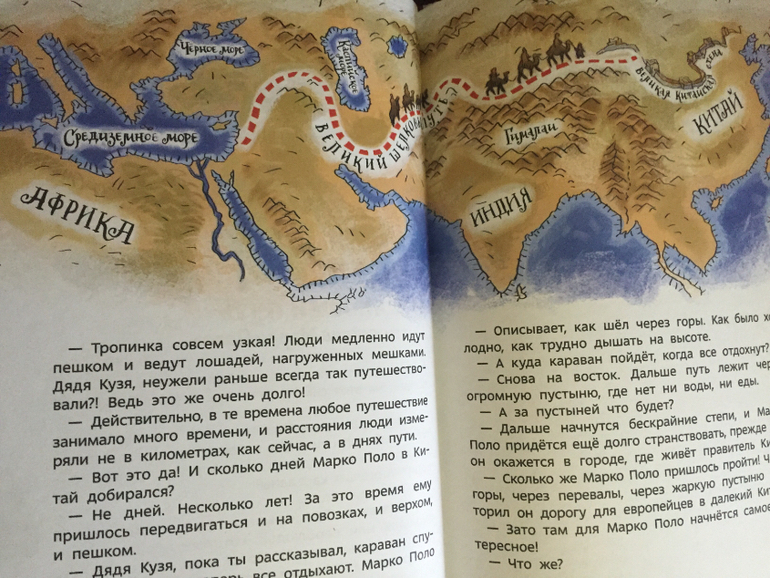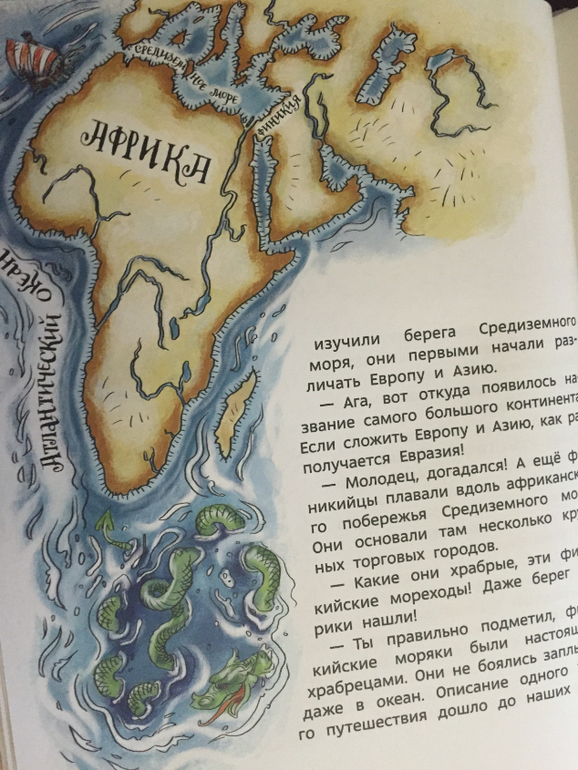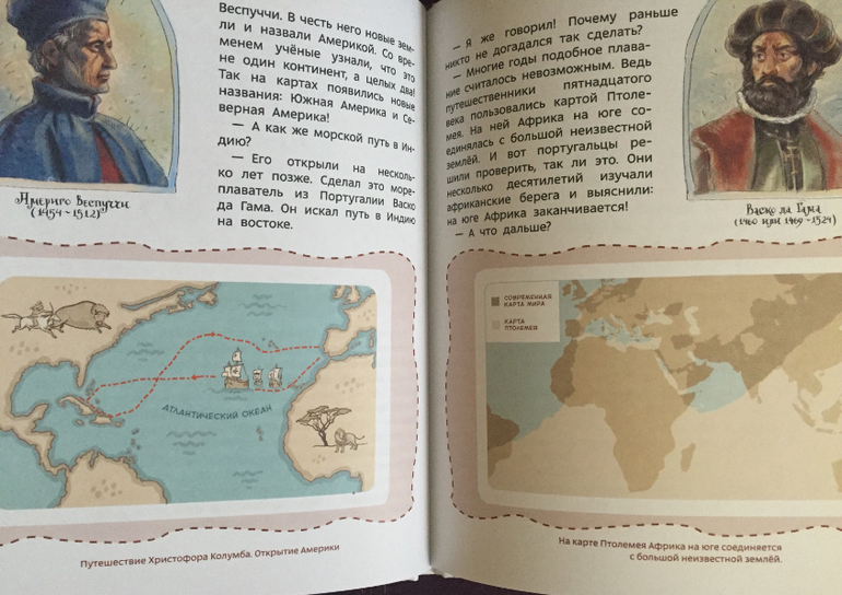 Если ребёнок, как моя дочка, ещё не очень хорошо знает карту мира, на слух будет довольно трудно уловить путь следования мореплавателей из одной точки в другую. А уж когда рассказывают о нескольких путешественниках, за ещё и маршруты из передвижения самые разные!... В книге же все описания сопровождаются простейшими картами, на которых все эти маршруты обозначены.