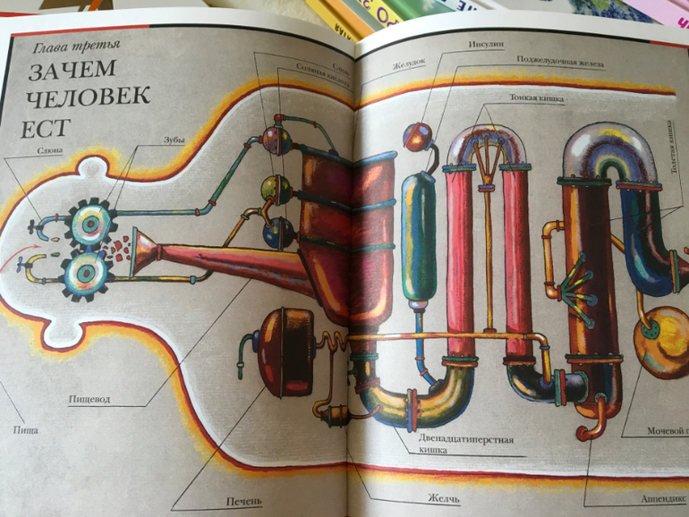 А потом незаметно перешли к третьей, четвёртой и так далее. В них рассматриваются вопросы, для чего человеку кровь, зачем и как мы дышим, о нашем "центре управления" - мозге. О слухе и зрении, о коже, о том, для чего человеку сон и как устроена память. И последняя глава - о неизученных до конца человеческих возможностях.
