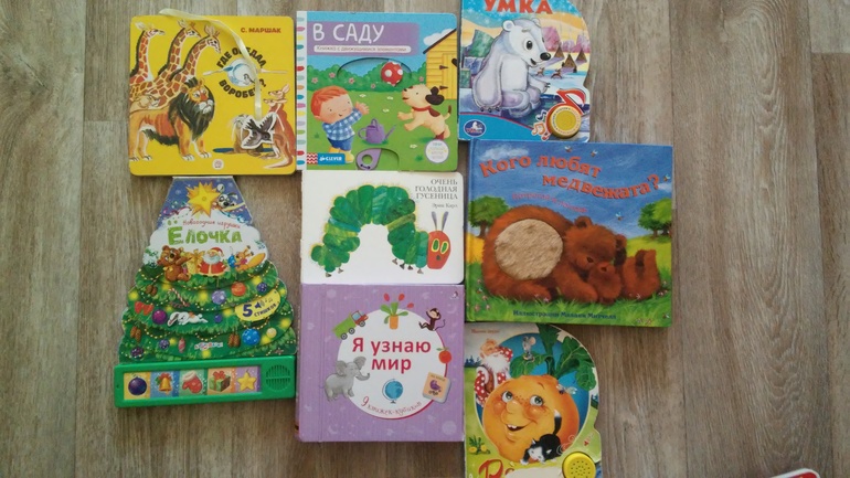 Репка и Умка также остались от старшей, Умку только рассматривает-слушать пока не хочет, ну и хорошо- на будущее есть полный вариант от Речи, а вот Репку - с удовольствием. Любим гладить медвежат и отрывать нос крокодилу кормить воробья. Гусеницу не очень жалует, приходится использовать все свои актерские возможности, чтобы увлечь дочь этой книгой - но очень нравится трогать дырочки и размахивать страничками-крыльями бабочки. Книга В саду с движущимися элементами от Клевера очень восстребована, как и Ёлочка, которая осталась от старшей. Книжки-кубики от издательства Робинс- замечательно идут у нас месяцев с 10