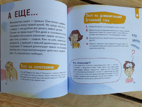 Разобравшись с пупками, Сема попросил еще что-нибудь поисследовать. И вот на ночь глядя мы стоим на одной ноге с закрытыми и открытыми глазами, проводим фокус со взлетающей рукой (не вышло! Но понравилось) и определяем нашу криворукость леворукость. С леворукостью вышло смешно. Например, оказалось, что у меня ведущая левая рука (полная чушь, я правша!), ведущий правый глаз и ведущая правая нога. Сема у нас не определился. У него в тестах все было каждый раз по-разному. Так я и знала! А папа наш сказал, что ему одинаково все равно, как руки складывать. Это понятно, он амбидекстр (владеет и левой, и правой рукой). Кстати, в тесте на то, какие нам достались гены, оказалось, что мы среднестатистические посредственные люди. Даже немного обидно стало.