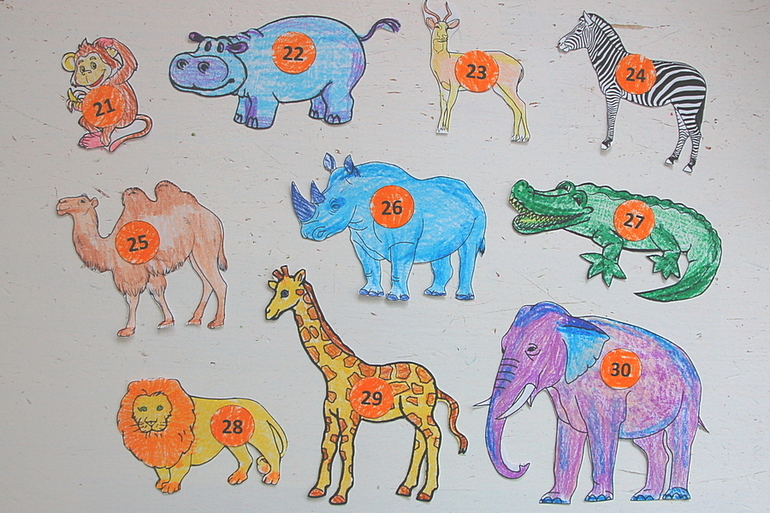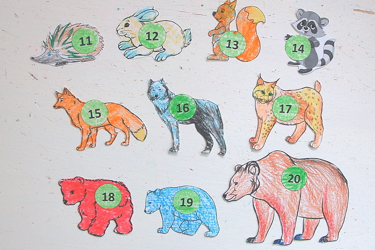 Поскольку наше знакомство с цифрами было на тот момент ограничено самими цифрами, я воспользовалась книжной ситуацией в конце, когда Козленок стал работать на паруснике и считать всех входящих зверей. И мы стали считать второй десяток из лесных зверей.