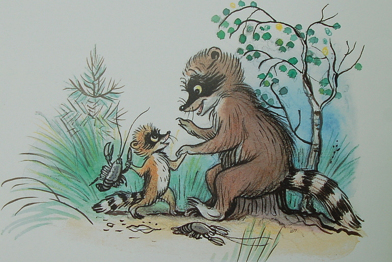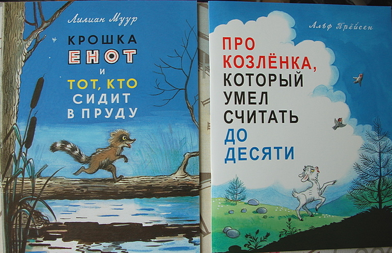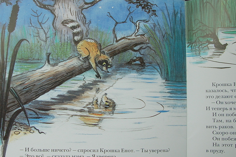 Лилиан Муур. Один из многочисленных любимчиков моего детства. Да и кто не любил этого пушистого полосатика, который боролся со своим отражением. Дети приняли сказку на ура. Мне кажется, она не похож на всё читаемое прежде и произвела какой-то переворот в их сознании. Даже при последующих прочтениях они верили в тайну сидящего в пруду. И очень переживали за Крошку Енота. Кроме выводов об улыбке мы обсудили еще отвагу маленького Енота и, конечно, распевали потом знаменитую песенку.