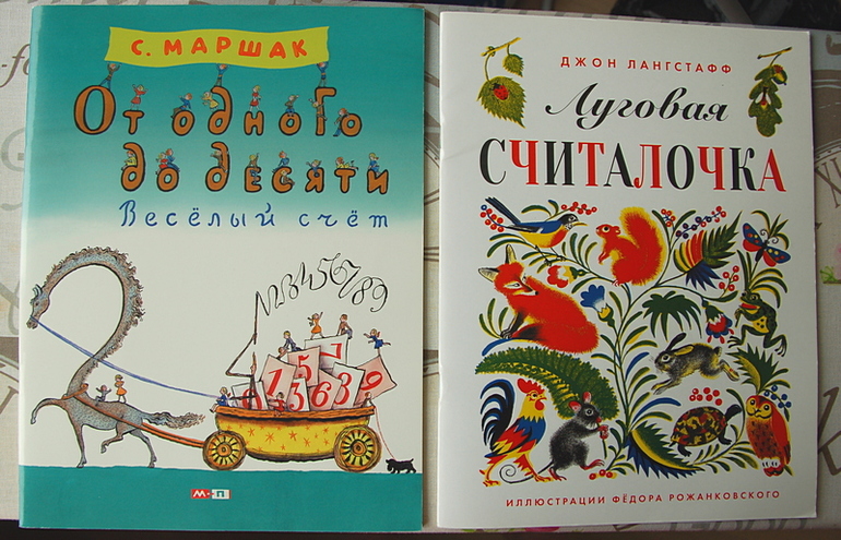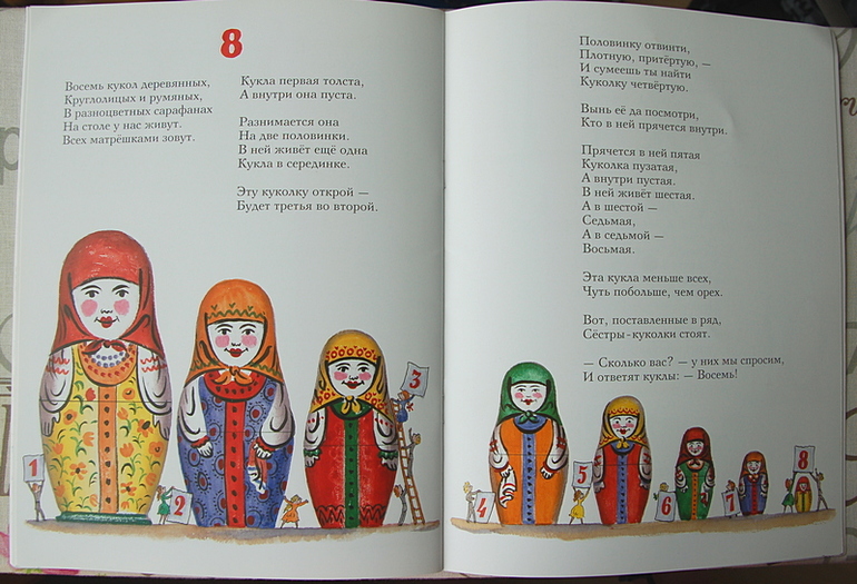 «От одного до десяти. Веселый счет» Маршака. Когда книга анонсировалась, читала очень много положительных отзывов от тех, у кого она была в детстве. Действительно, там не только цифры, но и начальный счет, понятие десятков и даже дни недели. Причем, насколько я поняла, раньше читали ее в 4-5-6 лет и не думали о том, что ребенок «должен» уметь считать до ста в два года. Озорные иллюстрации Конашевича неотделимы от книги. Поиграть тоже есть во что, например, в матрешки. С прошлого Питерского Салона я привезла детям матрешку, любят их до сих пор, аж краска облупилась, надо еще раз на Салон съездить ))