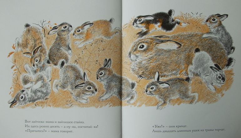 Иллюстрации Федора Рожанковского, хоть и выполнены в оранжево-серых тонах, очень подходят этой считалочке. Больше всего дети оценили пушистых зверей, но находили наперебой и пересчитывали всех персонажей.