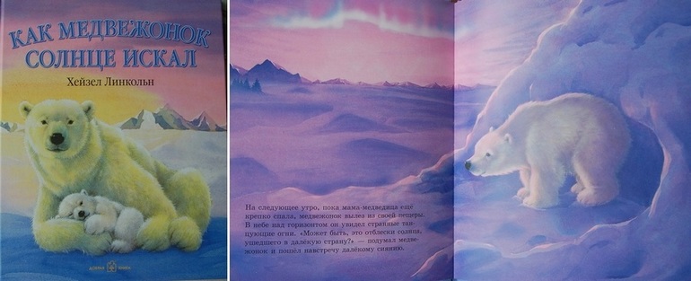В ней рассказывается, как медвежонок соскучился по солнцу и пошел его искать. По пути познакомился с разными животными. Правда, знакомства эти были очень поверхностными, никакой особой информации или посыла в них не содержится. Я бы отнесла эту книгу к книжкам-картинкам, поскольку текст в ней не несет практической ценности. Но зато иллюстрации великолепны. С бельком один из любимых разворотов, поскольку дома их у нас аж три штуки.