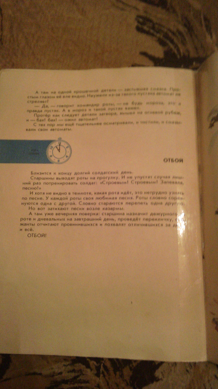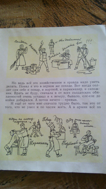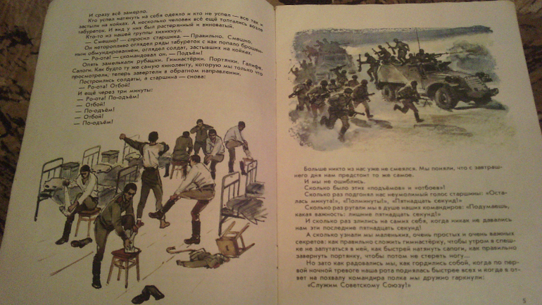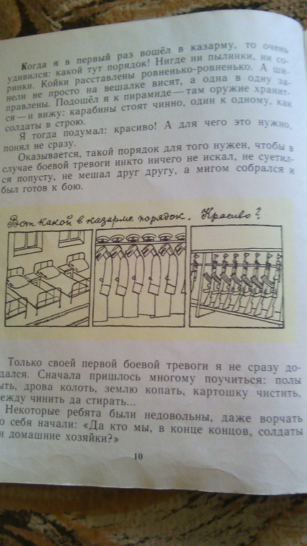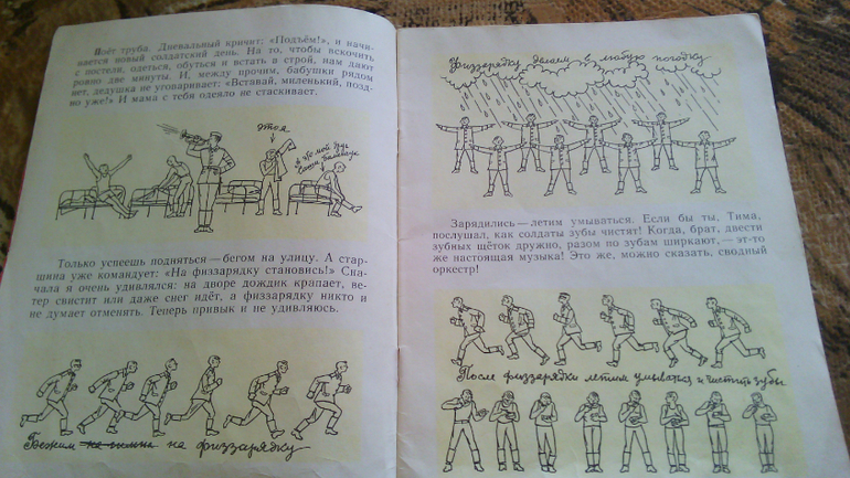 Рассказано все, что делают в армии по времени. Очень мне понравилось, как описана необходимость в зарядке и внешнем облике. Теперь он перед выходом всегда просит почистить обувь (даже если это резиновые сапоги или кроссовки))) Делаем вид, что начищаем))) Главное, чтобы потом сам не натер черной ваксой свои белые кеды)))