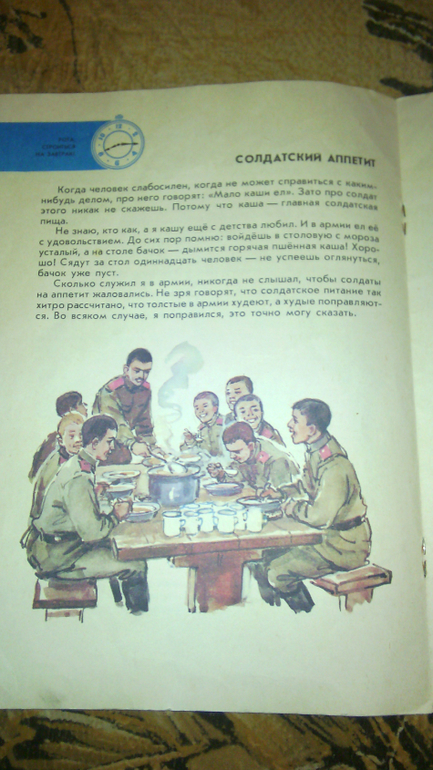 Дедушка так рассказывал про обеды в армии, особенно во время учений, что Егорушка с тех пор кашу уплетает за обе щеки. В садике даже воспитательница удивляется)))