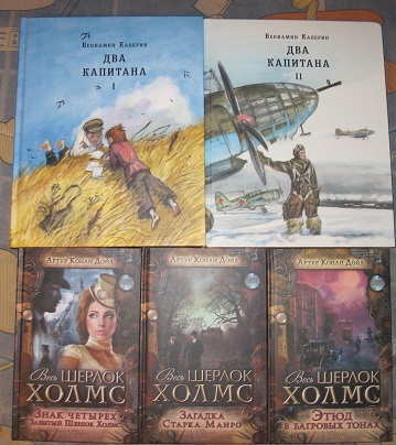 В. Каверин "Два капитана". А.К. Дойл. Серия "Весь Шерлок Холмс". Эти книги пошли на подарок сыну - на тринадцатилетие. Шерлока любит, всё, что было у нас из иллюстрированной серии, он перечитал, выбирала-выбирала, в итоге купила несколько таких, еще осталось в этой серии три книги, которых у нас нет, но там в отзывах про одну из книг написано, что куска текста не хватает, поэтому вот в раздумьях, брать остальные или нет... Представленные на фото книги про Шерлока сын уже прочел, спросила, есть ли опечатки - сказал, что не заметил - "был увлечен сюжетом". ))) А папа наш ворчит - зачем покупать книги без картинок, если их можно закачать в эл.книгу.... Но сын не читает в электронке, а книгам был очень-очень рад...