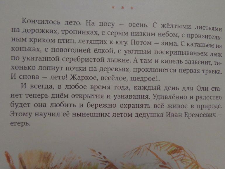 Мама отправляет на лето маленькую Олю в деревню (даже не деревню, а хутор в пять домов) к дедушке. Отправляет одну, на поезде со знакомой проводницей (правда, сейчас это уже кажется чем-то диковинным?). И дедушка встречает её утром с верным псом Цыганом и лошадью Орликом. Что её ждёт впереди? - лето, полное солнечного тепла, долгих лесных прогулок и новых знакомств. Она сразу вливается в компанию местной ребятни, знакомится с семейством лосей по главе с Васькой))), заботится о раненой птичке завирушке и слушает, запоминает истории своего "дедуни") - защитника и друга всех животных и птиц в лесу - егеря!