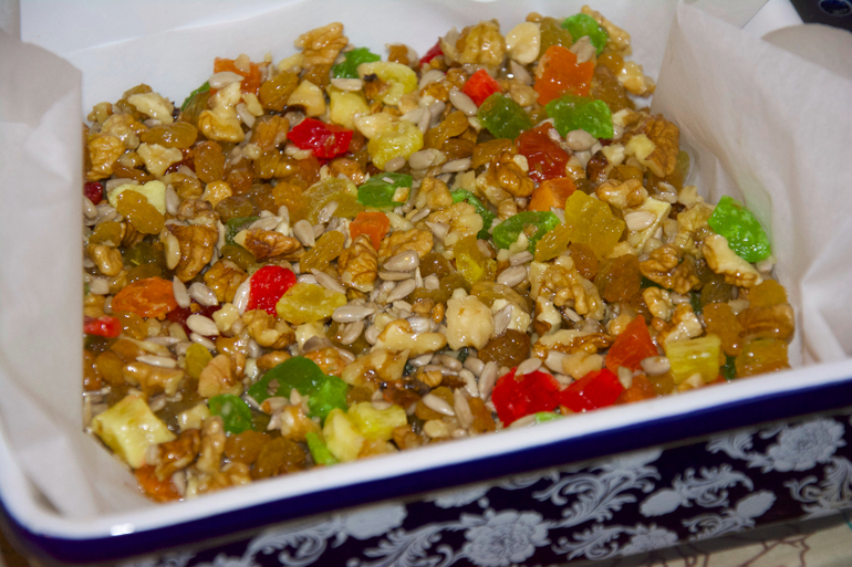 Покупаю пачку овсяных хлопьев, тех, которые долго варятся, грецкие орехи, семечки, цукаты, изюм, мед, корицу, лимон, оливковое масло, коричневый сахар и делаю себе счастливую маму!